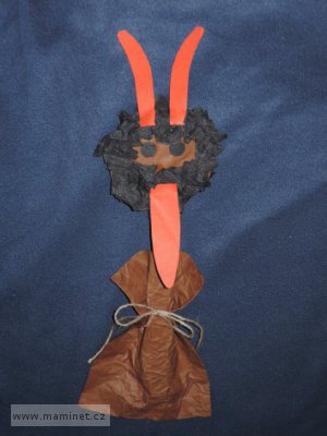 Ze čtvrtky si vystřihneme kolečko, které přilepíme na dřevěnou špachtličku. Poté kolečko polepíme z obou stran hnědým papírem. Krepový papír rozstříháme na malé čtverečky zhruba o straně cca 3 cm a jednotlivé kousky zmačkáme. Kolečko z jedné strany potřeme celé lepidlem a zmačkané kousky na něj přilepíme. Druhou stranu kolečka potřeme a polepíme také téměř celou. Vynecháme však místo na oči. Oči vystřihneme z černého papíru a nalepíme. Z červeného papíru si připravíme jazyk a rohy, které opět přilepíme. Hnědý papír zmačkáme a opět rozevřeme. Přehneme napůl a na jednu polovinu přilepíme špachtličku. Špachtličku a celý papír (z vnitřní strany - špachtlička bude uvnitř) potřeme po obvodu lepidlem a obě poloviny papíru slepíme. Až budu vše suché, převážeme pytel provázkem.