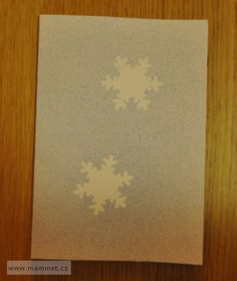 Čtvrtku rozpůlíme tak, aby vznikly dvě čtvrtky o řád menší (ze čtvrtky A4 vzniknou dvě čtvrtky A5). Na jednu část si předkreslíme šablonky a vystřihneme. Druhou část přeložíme tak, aby nám vznikl rozměr opět o řád menší (v našem případě A6). Na vnější stranu přiložíme vystřižené šablonky. Štětec namočíme ve vodě a v barvě a z výšky třetím přes sítko postříkáme celou vnější stranu přáníčka. Necháme zaschnout.