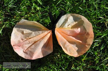 Hedvábný papír namočíme ve vodě a rozprostřeme. Štětcem naneseme po kapkách vodové barvy a necháme zaschnout. Po uschnutí vystřihneme z papíru libovolný tvar - obdélník, kruh (viz úvodní foto), ovál čtverec atd. Složíme do tvaru harmoniky (přeložíme, otočíme, přeložíme, otočíme atd.). Z chlupatého drátku odstřihneme požadovanou délku, uprostřed harmoniky ho přeložíme a dvakrát zakroutíme, aby vznilky tělíčko a tykadla.