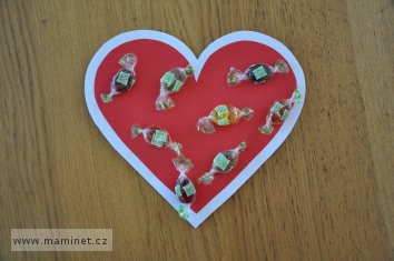 Větší čtvrtku přehneme na polovinu (na rozměr A4). Na menší čtvrtku nakreslíme srdíčko. Nekreslíme až ke krajům. Je potřeba, aby bylo menší než bude srdíčko na větší čtvrtce. Vystřihneme a nalepíme na přehnutou větší čtvrtku tak, aby jedna jeho dlouhá strana byla rovnoběžně s ohybem větší čtvrtky (asi 1 cm od přehybu). Kolem srdíčka dokreslíme druhé srdíčko (asi 1 cm široký pruh) a vystřihneme. Přehyb nerozstřihneme. Na srdíčko rozmístíme bonbóny. Až budeme s rozmístěním spokojeni, bonbóny postupně přilepíme. Necháme zaschnout.